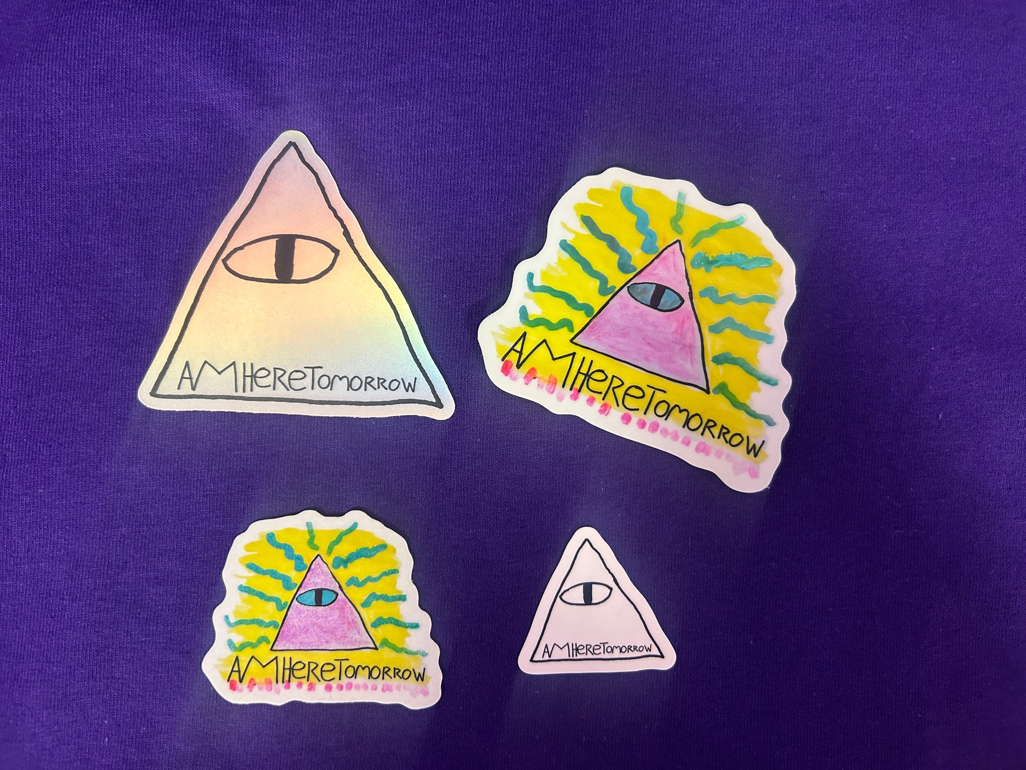 Be your own Tomorrow God with these Am Here Tomorrow logo stickers for your phone, water bottle, laptop, skateboard, your favorite bridge— wherever you wanna stick it, this sticker will stick!